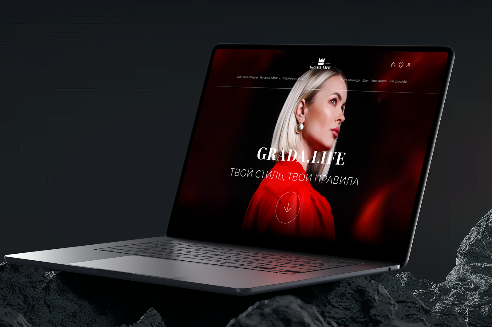 Название GRADA.LIFE выполнено в лаконичной, элегантной типографике с чистыми линиями и идеально выверенным межбуквенным расстоянием. Белый текст контрастирует с темным фоном, создавая эффект ясности и акцента. Минималистичное навигационное меню и иконки в верхней части экрана ненавязчиво интегрированы в дизайн, сохраняя визуальный баланс. Круглая кнопка со стрелкой вниз, выполненная в тонкой белой линии, добавляет завершенности и намекает на глубину содержания.